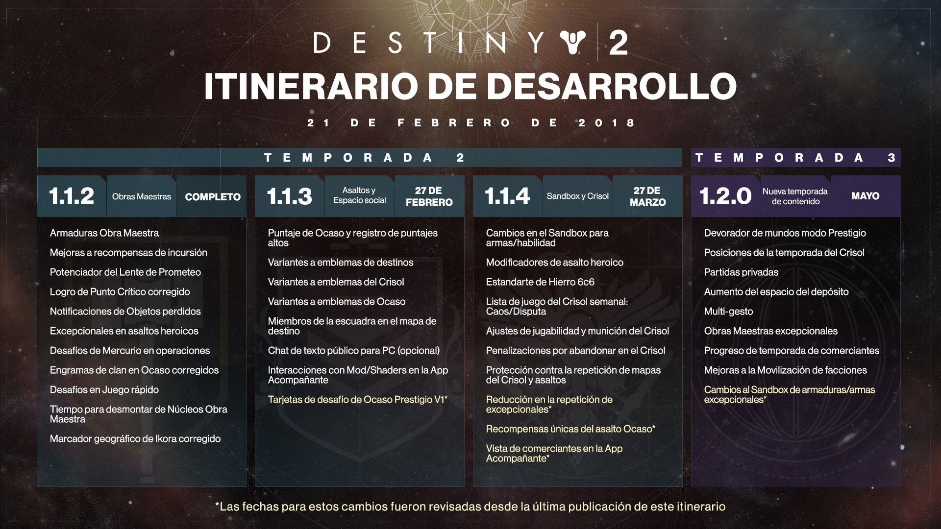 TeraGames / InsurgentePress, Ciudad de México.- Hace algunas semanas te compartimos el Itinerario de Desarrollo de Destiny 2 a fin de darte un adelanto de los cambios en los que estamos trabajando. Tal como lo hemos estado mencionando, este itinerario es nuestra estimación más actual y haremos todo lo posible por mantenerte al tanto de nuestros planes según se vayan trazando.